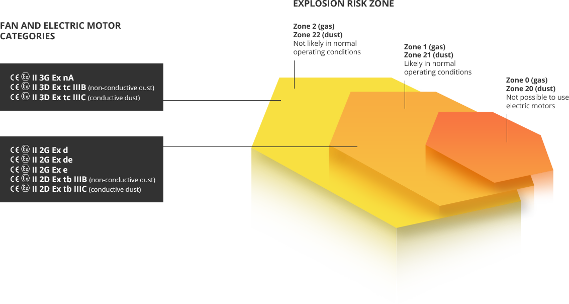ATEX (Directive 2014/34/EU) sets mandatory safety rules for equipment used in explosive atmospheres; Sodeca fans meet these rules and are accepted by South-African authorities.
